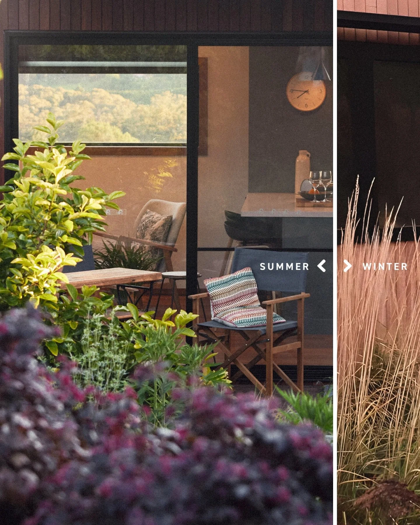 Our first three modular building situated in central Toolangi not far from the old Toolangi State Forest. Lots of north facing glass and a decent wood heater ensures that this home will maintain its cosy charm even in the depths of winter when snow could be falling. The idea behind this building was that the main home be separated from the single smaller module so that you were not having to heat and cool the entire house. The smaller building functioned as a gym and guest accommodation. Having the deck as a buffer increased the privacy between the two spaces. An architectural matt black steel cladding worked well with the silver top ash vertical timber boards.